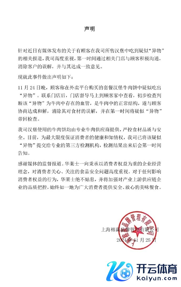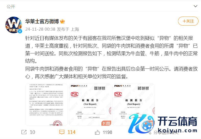 11月28日开yun体育网,话题#华莱士回答汉堡吃出形似尾巴异物#冲上热搜。