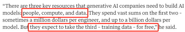 《卫报》在一篇报说念中采访了前东说念主工智能公司Stability AI高管埃德·牛顿-雷克斯,他指出,生成式东说念主工智能公司成立东说念主工智能模子需要三种要津资源——东说念主员、计较和数据。雷克斯指出,一些公司在前两者上破耗巨资,有时在一个工程师身上破耗超100万好意思元,而每个模子破耗高达10亿好意思元,但却但愿免费赢得西宾数据。