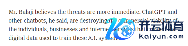 一些盘问东说念主员则觉得这种恐吓更为成功。据《纽约时报》报说念,曾在OpenAI担任东说念主工智能盘问员近4年的苏希尔·巴拉吉暗示,Chat GPT和其他聊天机器东说念主正在糟塌个东说念主、企业和互联网就业的生意生涯技艺,而恰正是这些个东说念主、企业等创造了用于西宾东说念主工智能系统的数据。巴拉吉暗示,“对所有这个词互联网生态系统来说,这不是一个可无间的模式。”