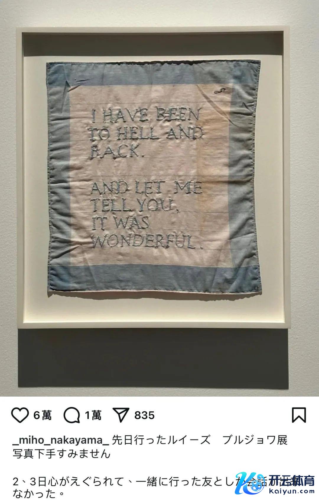 就在离世前不久,她参不雅了着名艺术家路易丝·布尔乔亚的展览,并拍下了该艺术家生前随身佩戴的一块手帕,上面的七行英文意为:“我往复于地狱,让我告诉你,那处尽头棒。”