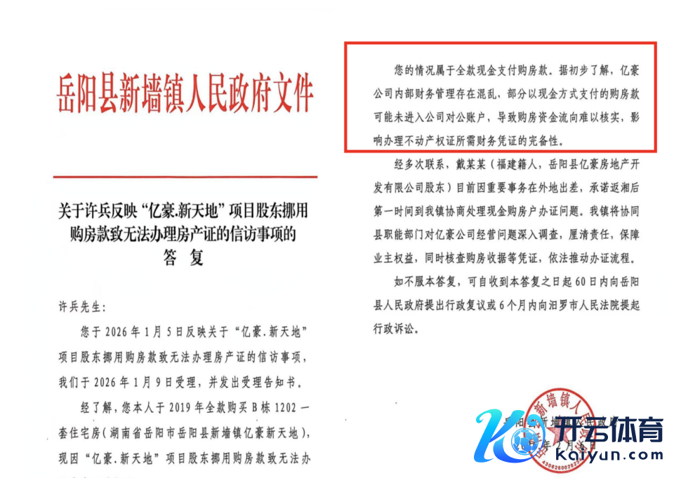 2026年2月6日,岳阳县新墙镇政府回复许先生称,他的情况属于全款现款支付购房款,据初步了解,开拓商里面财务料理存在繁杂,部分以现款神志支付的购房款可能未投入该公司对公账户,导致购房资金流向难以核实,影响办理不动产权证所需财务证据的完备性。
