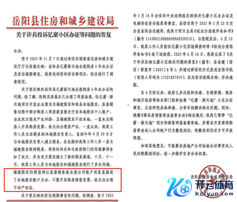 2025年12月29日,岳阳县住房和城乡建树局书面回复许先生说,他购买的房屋已办理网签备案手续,但该技俩开拓企业是由福建鼓吹和岳阳县腹地鼓吹共同开拓,房屋销售历程中部分购房主谈主将房款径直支付至腹地鼓吹个东谈主账户,导致两边鼓吹产生纠纷,且福建鼓吹不在岳阳县当地,一直未为购房主谈主开具购房发票,故无法办理房产证。咫尺多部门已建树专班组,磋商具体举措贬责此事。