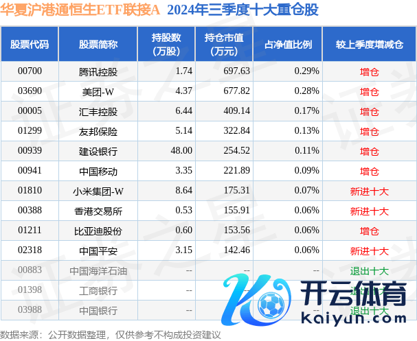 中原沪港通恒生ETF伙同A为指数型-股票基金,字据最新一期基金季报露出,该基金财富成立:股票占净值比2.26%,无债券类财富,现款占净值比5.4%。基金十大重仓股如下: