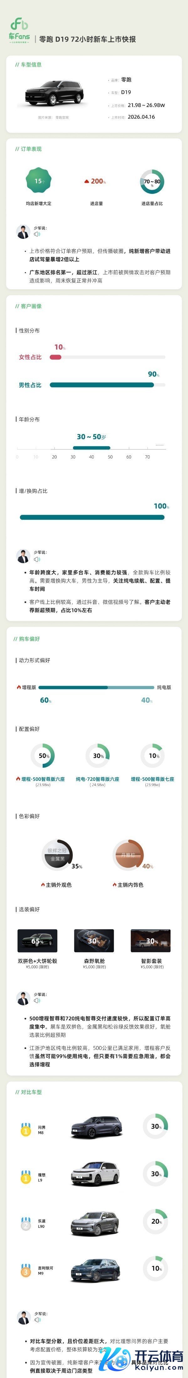 竞品对比喻面,零跑D19的潜在客户对比车型较为散布,且价位差距较大。在对比车型中,30%的客户对比问界M8云开体育,30%对比理念念L9,20%对比乐说念L90,10%对比祥瑞星河M9。其中,对比理念念、问界的客户主要考量建立与价钱,举座预算较为弥漫。