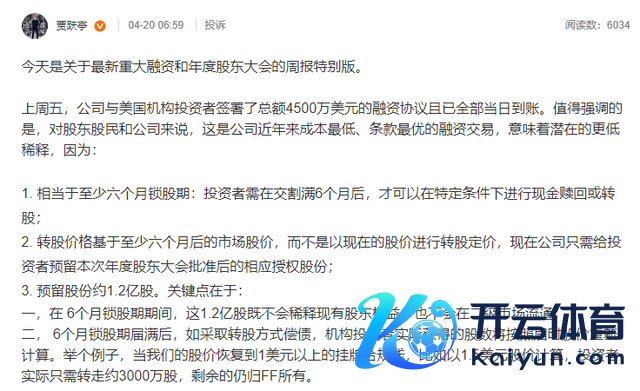 贾跃亭作念了个更具体的推算:扩股提案中拟加多45%的授权股份,其中约1.2亿股是为这次机构投资者预留的。在锁股本领,这些股份既不会稀释现存鼓励权柄,也不会流入二级阛阓。6个月后若是继承转股,施行转走的股份数目将按届时股价重新规划——假定FF股价收复到1.5好意思元,投资者最终只需转走约3000万股,剩余部分仍归FF统统。