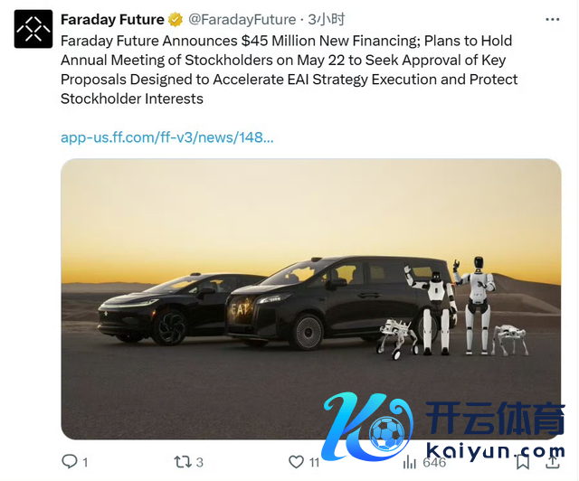 近日,法拉第畴昔(Faraday Future,下称“FF”)庄重告示,公司已获胜得到好意思国某机构投资者4500万好意思元(约合东谈主民币3.07亿元)的新融资。