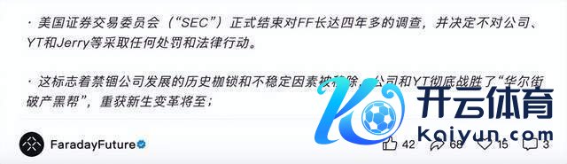 值得一提的是,一个月前,好意思国证券往返委员会(SEC)针对FF的里面访问门径庄重宣告完了,且SEC未对公司采用任何实质性的行政处罚顺次。