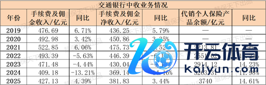数据自满,2025年,交通银行达成手续费及佣金净收入381.83亿元,同比增长3.44%。这约略与其2024年中收大幅下降联系,其2024年降幅位列六大行之首。但这一增速,也依然高于其利息净收入增速。