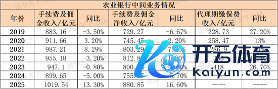 其实,农业银行在代销保障方面具有恒久上风,即使是在2024年行业多数大降的时分,其年报仍暗示,其代理保障业务边界、手续费收入均处于同行越过地位。
