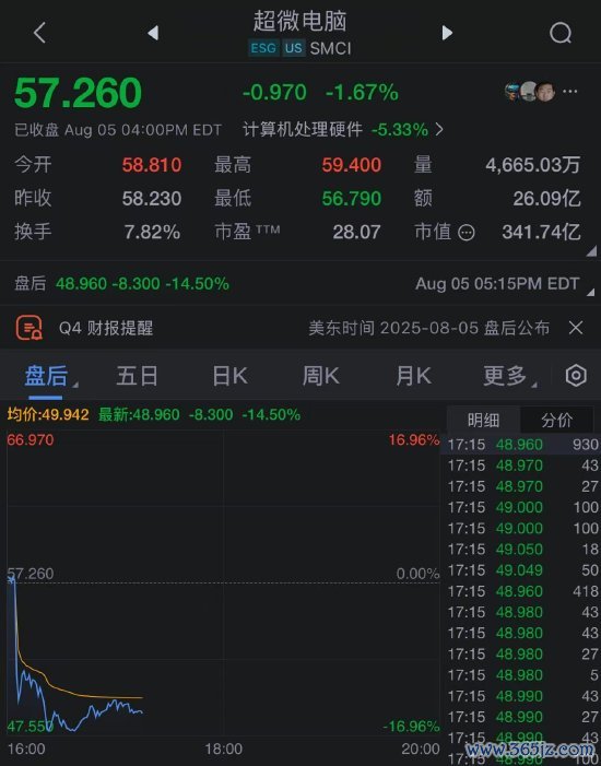 做事器制造商超微电脑(Super Micro Computer)周二公布令东说念主失望的第四财季功绩并发布疲软的季度功绩指点后,其股价在盘后往复中下落 15%。