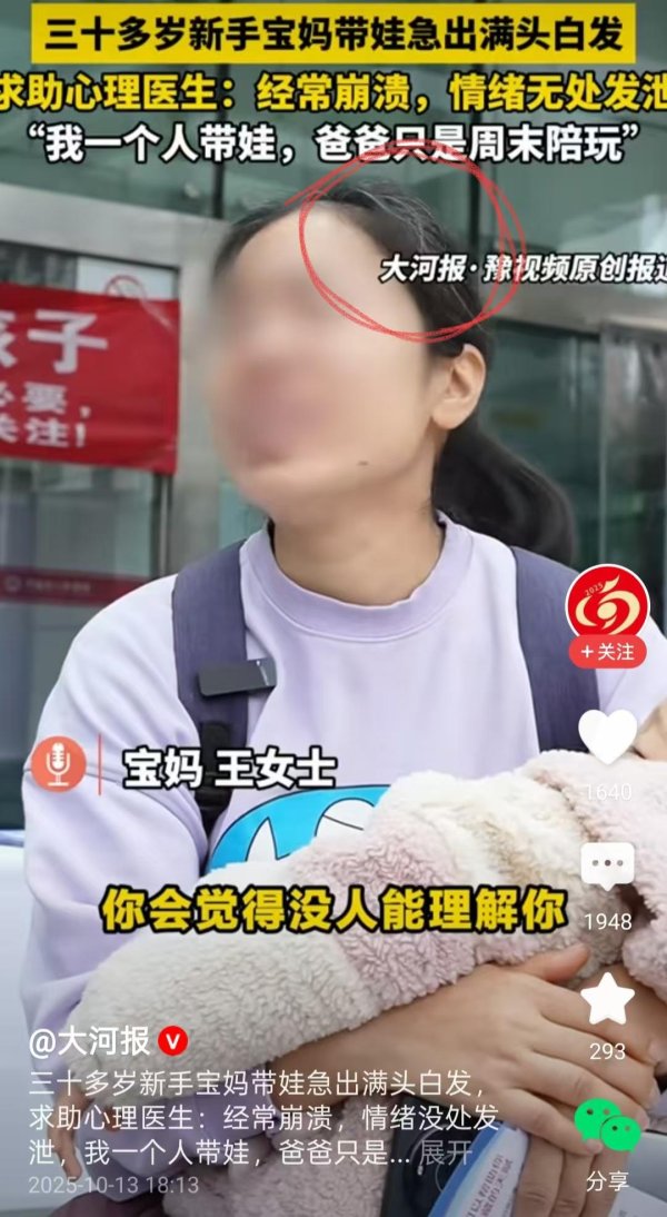 刷手机看到一条挂在热榜上视频:30多岁的外行宝妈带娃,因为惊恐急出满头鹤发。 视频中,外行宝妈说时常齐是一个东谈主带娃,爸爸的参与感很低,仅仅周末陪玩,而我方却时常心理崩溃,又无处发泄。 只可说这个宝妈还是相比镇静,说是我方的问题,为了幸免把无处发泄的恶意理给宝宝而去辩论心理医师。 在视频中不错显豁的看到,这名才30多岁的外行宝妈前后齐长了不少的鹤发,如果只看头发,50岁齐不啻了,毕竟身边许多50岁的女性一又友齐莫得她的白头发多。 虽然,手脚别称二胎宝妈,带娃路上的惊恐和无助我亦然深有体会的。